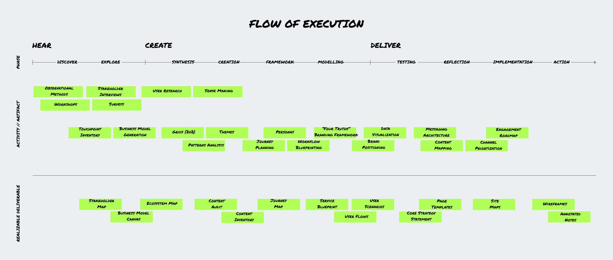 In flexible succession are phased activities and deliverables that enable me to appropriately preserve a level quality in the data once distillation begins. They outline the human-centred design process which I’ve been trained in — to which I iterate and repeat over time to better understand both the client and end user needs.